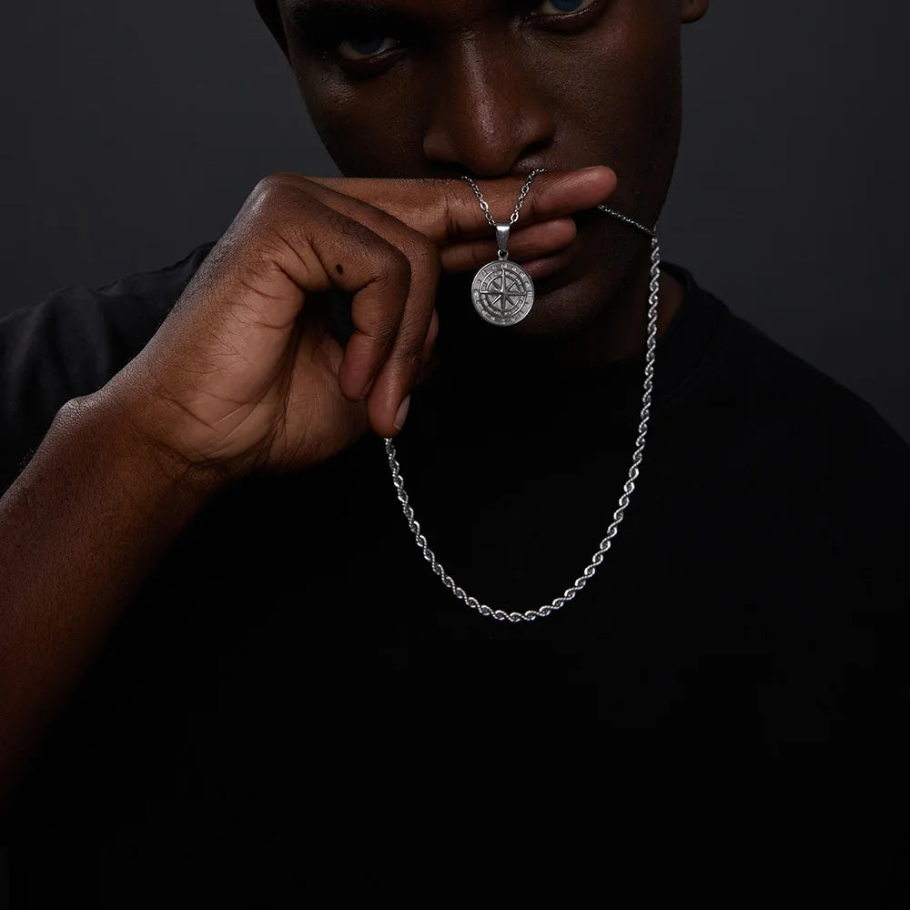 This Layered Compass Necklace combines three distinct chain styles into one effortlessly cool accessory. Featuring a detailed sailing compass pendant suspended from Cuban, Figaro, and wheat chains, this pre-layered set delivers instant style without the hassle of coordinating multiple pieces.